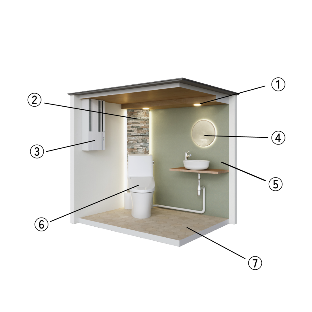 ⑤壁/クロス:多くの簡易トイレに使われているプラスチック製の薄い板ではなく、吸音、断熱を考慮した壁材を利用しているため、比較的外部を気にせず使用できます。