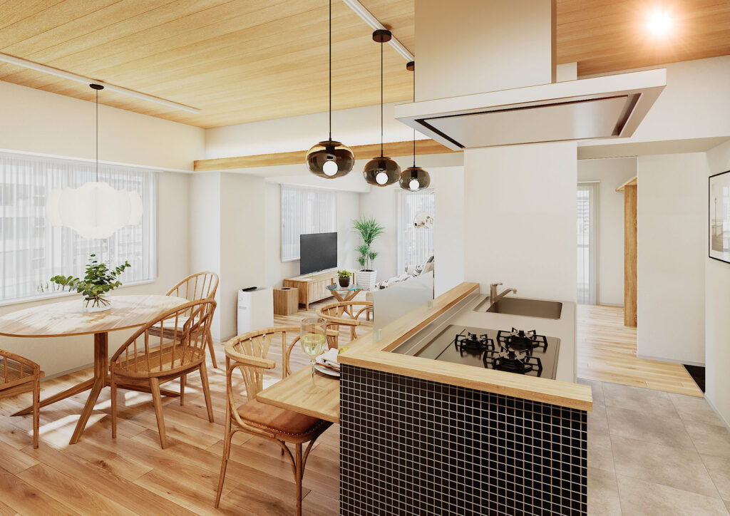 フローリングや天井の羽目板を長手ではなく、眺望が抜ける短手に向ける事で、暮らしの中心となるキッチンやダイニングから視線を誘導。